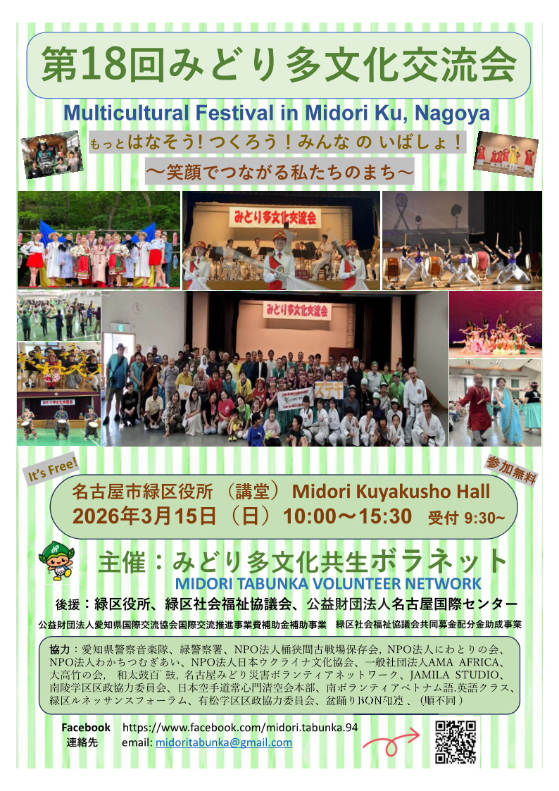 3月15日 『第18回みどり多文化交流会』に参加します 3月15日は名古屋市緑区役所(講堂)にて、第18回みどり多文化交流会が開催されます。JUCAもイベントに参加する予定です。 日時:2026年3月15日(日) 10:00~15:30 (受付 9:30~) 主催:みどり多文化共生ボラネット 後援:緑区役所、緑区社会福祉協議会、公益財団法人名古屋国際センター お近くのみなさまは是非お越しください #第18回みどり多文化交流会